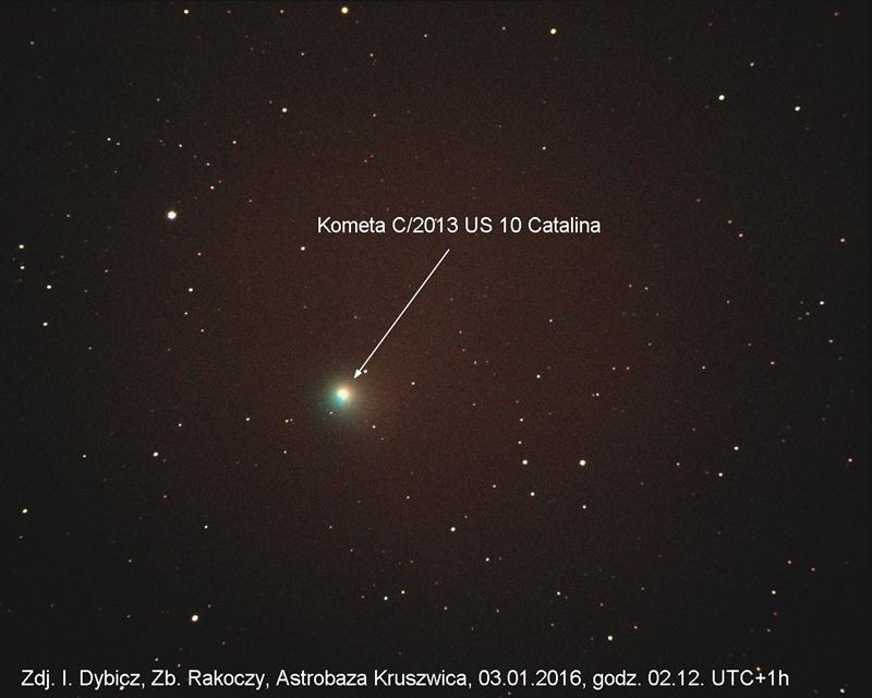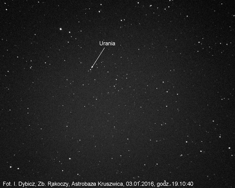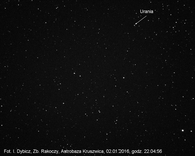 Zainspirowani informacją podaną w kalendarzu astronomicznym Uranii 6/2015 pt. „ Planety i planetoidy” postanowiliśmy w kruszwickiej Astrobazie zapolować na Uranię. Drugiego stycznia 2016 zapowiadała się mroźna i pogodna noc dlatego zaplanowaliśmy obserwacje i fotografowanie komety C/2013 US 10 Catalina. W trakcie oczekiwania na pojawienie się nad horyzontem komety podjęliśmy próbę sfotografowania planetoidy (30) Urania jeszcze przed przypadającą na 14 stycznia jej opozycją. Po ściągnięciu aktualnych efemeryd do programu Stelarrium ustawiliśmy teleskop na podaną pozycję. Odnalezienie jej nie było to łatwe, ponieważ program Stellarium tej samej wersji na różnych komputerach pokazywał inne położenia planetoidy. Po kilkunastu próbach udało się, ze 100 % pewnością, potwierdzić położenie Uranii wśród gwiazd gwiazdozbioru Bliźniąt. Wykorzystując program Maxim DL i sekwencyjne przełączanie zdjęć można było zaobserwować ruch planetoidy na tle innych gwiazd. Do obserwacji wykorzystaliśmy sprzęt będący na wyposażeniu naszej Astrobazy, teleskop APO 80 mm i kamerę Atik 460 EX. Zadowoleni z odnalezienia planetoidy o tak bliskiej nam nazwie mogliśmy już ze spokojem czekać na pojawienie się komety Catalina, która okazała sie obiektem dużo łatwiejszym do odnalezienia i sfotografowania. Następnego dnia około godziny 19-tej powtórzyliśmy obserwacje Uranii aby zobaczyć jej nowe położenie.