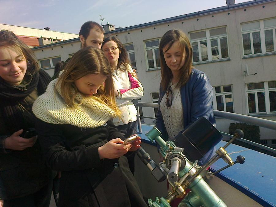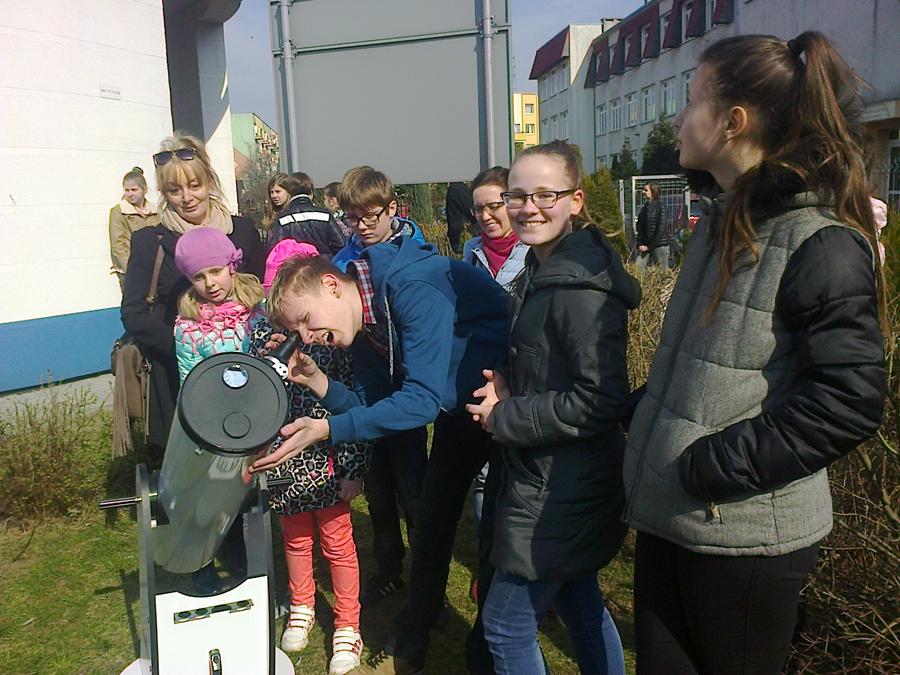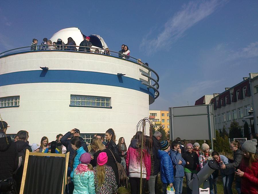 Najgorętszym tematem dnia w kruszwickiej Astrobazie było zaćmienie Słońca. Wszyscy, którzy przybyli do przyszkolnego obserwatorium w pierwszy dzień astronomicznej wiosny czyli 20 marca 2015 roku, mogli obserwować, fotografować i nagrywać to spektakularne zjawisko. Każdy z nich mógł prowadzić bezpośrednie obserwacje przez specjalistyczne szkiełka, okulary astronomiczne, maski spawalnicze i oczywiście teleskopy znajdujące się na wyposażeniu naszej Astrobazy. Wszystkich bardzo zainteresowała obserwacja zaćmienia przedstawiona poprzez projekcję okularową. Pozwoliła ona na śledzenie tego zjawiska więk-szej liczbie osób.